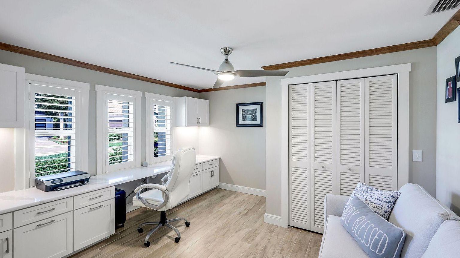 This sophisticated home office blends functionality with coastal-inspired serenity, where soft sage walls are framed by warm wood crown molding. Crisp white plantation shutters filter natural light across the expansive built-in workspace, featuring abundant cabinetry for ultimate organization on light hardwood flooring.