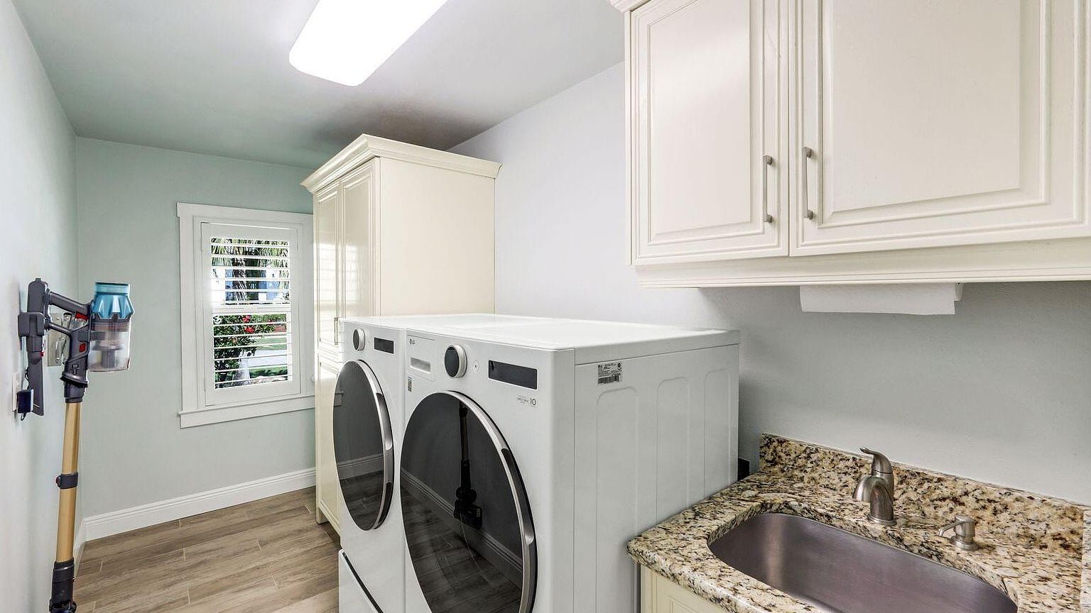 This beautifully appointed laundry space blends form and function with sleek white cabinetry and brushed nickel hardware. Modern front-load units anchor the room, while a generous granite countertop offers ample folding space. The coordinating sink makes hand-washing a breeze, all set against soft gray walls.